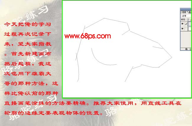 1、首先新建画布,大小自定,然后起稿,用直线工具在轮廓的边缘定要表现的位置。