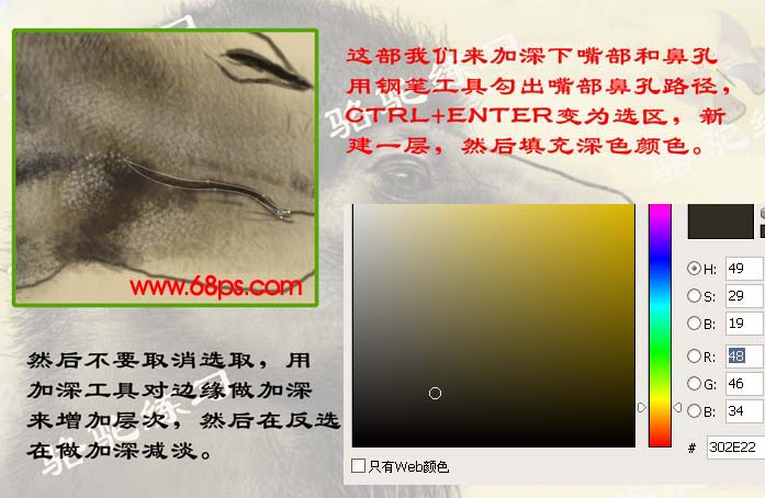 6、这一步我们来加深下嘴部和鼻孔,用钢笔工具勾出嘴部鼻孔路径,Ctrl