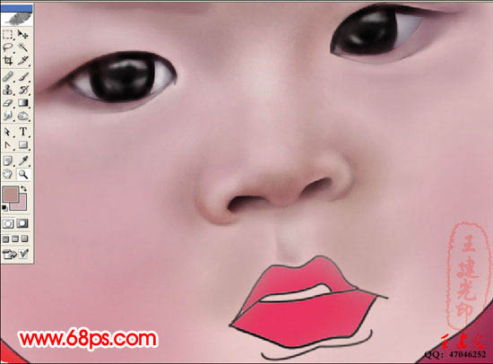 5、宝宝鼻子的绘制。将前景色调为适当的颜色,用画笔结合加深/减淡工具对鼻子进行绘制。