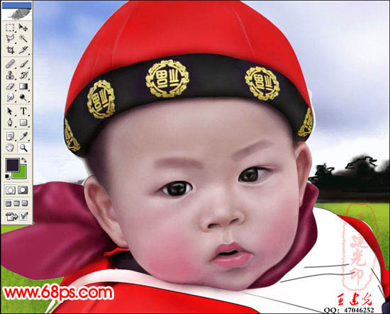 15、绘制宝宝帽子图案。先用钢笔工具勾出图案轮廓,然后填空金黄色,并在图案中写上一个倒立的“福”字。