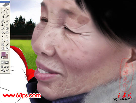 16、奶奶皱纹处理,先用钢笔工具勾出皱纹的路径,然后对路径进行描边,但是要主要细节的明暗处理。