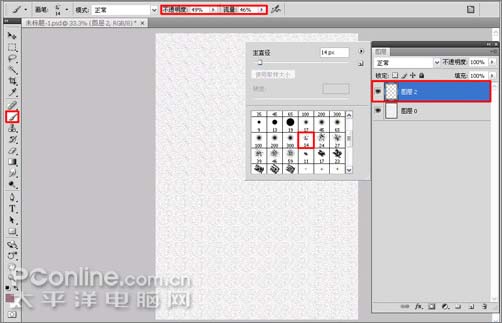 14 像素”笔尖,在工具选项栏中设置不透明度为:49%,流量为:46%,如图3所示。