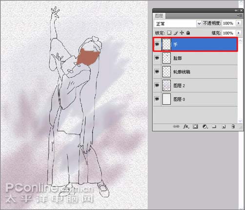 8、在选择“脸部”图层的状态下,在脸部的位置涂抹出脸的颜色,脸部RGB值为:#ab6b58;再新建一个图层并命名为“手”,如图8所示。