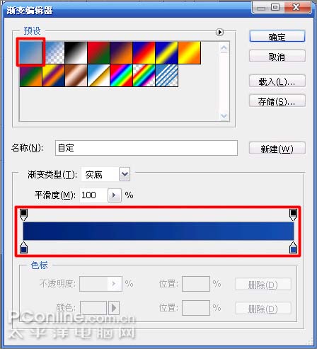 10、弹出“渐变编辑器”,选择其中的“前景色到背景色渐变”,再设置其渐变颜色,如图10所示。