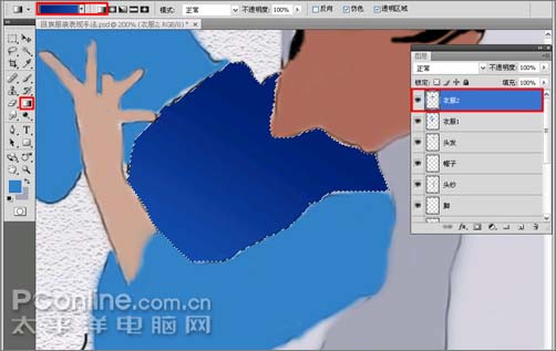 12、再新建“衣服3”与“衣服4”图层,利用钢笔工具勾勒出其轮廓,再转换为选区,然后在设置好前景色的状态下,按Alt+Delete组合键填充其颜色的方式进行填色,“衣服3”的RGB值为:#1862b5,“衣服4”RGB值为:#2674b6,填充后如图12所示。