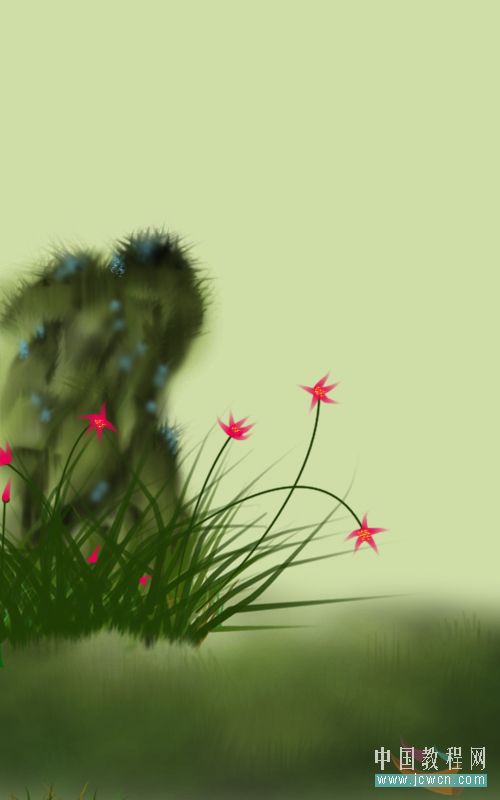 5、在岩石图层上再新建一图层,选着画笔工具切换到画笔设置调板,其实参数是把笔触的大小设置小一些。把间距拉到1%。然后设置形状动态里面的大小抖动——控制项设置为渐隐,数量为200.然后在作图区用浅、深绿色画出兰花的叶子(先浅后深)。画花径时,用钢笔工具随意描出路径,然后使用路径描边就