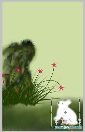 8、兔子画好后,打开所有隐藏的图层,用变形工具把刚才的兔子放小,调整到一个合适的位置。再作以一些调整达到自己想要的效果就OK了。