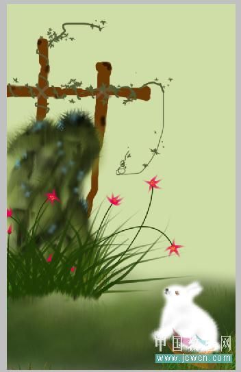 9、我们在草地图层上新建一个图层,用画笔选择与木头相近的颜色。在岩石的后面随意画几根栅栏,再用钢笔工具勾出几根藤蔓点缀一下,来填补画布后面的空白处。再给图的下方加一点小草这样看起来要协调一些。