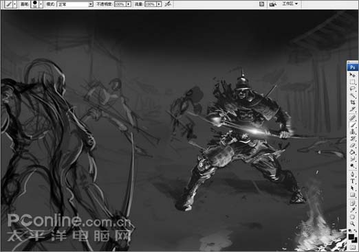 2、优先考虑素描关系,把草稿深入下去。这一步主要考虑大体结构和动势。