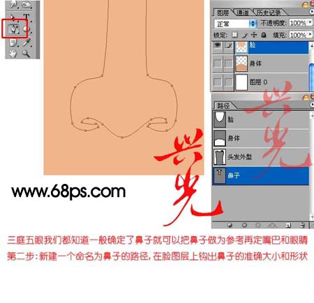 2、新建一个命名为鼻子的路径,在脸图层上勾出鼻子的准确大小和形状。