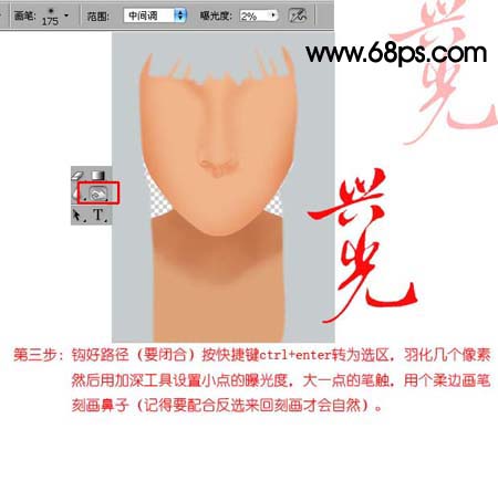 + Enter转为选区,按Ctrl + Alt + D羽化几个像素,然后用加深工具设置小点的曝光度,大一点的笔触,用个柔边画笔刻画鼻子。