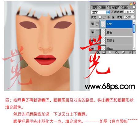 4、按照鼻子的制作方法,再新建嘴巴、眼睛图层及对应的路径,勾出嘴巴和眼睛形状填充颜色。然后先把唇裂线加深一下,以区分上下嘴唇。顺便把眉毛勾出羽化大以点,填充深色。