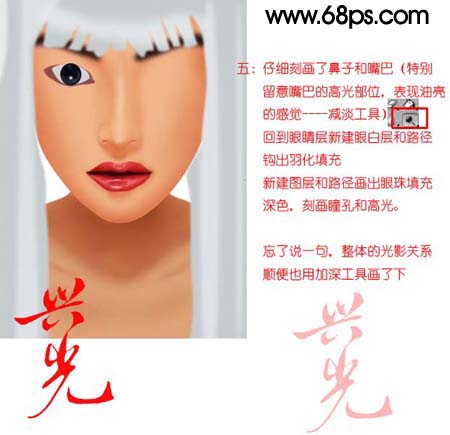 5、仔细客户鼻子和嘴巴(特别留意嘴巴的高光部分,表现有两的感觉),回到眼睛图层新建眼白和路径层勾出羽化填充银灰色。新建图层和路径画出眼珠填充深色,客户瞳孔和高光。