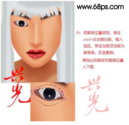 6、把眼珠位置放好,按Ctrl点击眼白层,载入选区。保证当层活动层为眼珠层,反选删除。再勾出双眼和眼袋位置如下图。