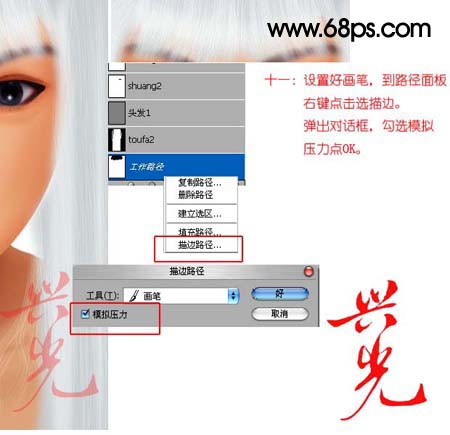 11、设置好画笔,到路径画板右键点击选描边。弹出的对话框,勾选模拟压力勾选。