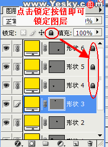 如果隐藏图层是为了在修改的时候保护这些图层不被更改的话,锁定图层则是最彻底的保护办法。在图层面板中有一个像“锁”一样的图标,选重要锁定的图层点击这个图标就可以锁定图层了,图层锁定后图层名称的右边会出现一个锁图标(图21)。当图层完全锁定时锁图标是实心的,当图层部分锁定时,锁图标是空心的。