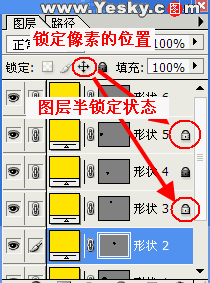 “锁”图标是完全锁定图层,除此之外还可以锁定像素、锁定像素的位置等等。如图22,使用锁定像素位置按钮,图层的锁定图标是空心的呈半锁定状态。