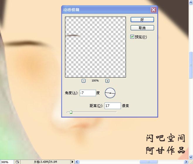 眉毛需要新建图层,勾出眉形,填充褐色,再执行------滤镜------模糊------动感模糊;参数设制如下;