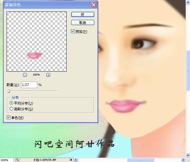 嘴巴很简单,新建层,勾出嘴形,也是用加深减淡方法,完后给嘴巴增加一些质感,在滤镜-----杂色-----添加杂色;参数如下;