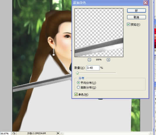 8.宝剑的画法主要是显示出它的质感,剑身要注意高光,明暗部位同样是用加深减淡,在执行滤镜-----杂色-----添加杂色;参数如下: