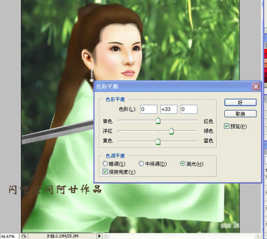 11.灰色的衣服不太好看,与背景也不协调,我们这副作品主色调是绿色,我们给小龙女衣服换一下色彩,在图像/色彩平衡里执行以下参数: