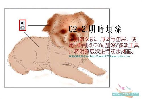 分别对头部、身体等图层,使用【中间掉/20%】加深/减淡工具,将明暗层次进行初步刻画。