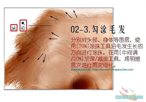分别对头部、身体等图层,使用【70%】涂抹工具沿毛必生长的方向进行涂抹。在用【中间调/20%】加深/减淡工具,将明暗层次进行再次细化。