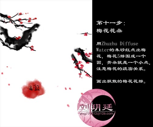 用笔画的朱砂红点出梅花,梅花5瓣围成一个圆,骨朵就是一个小点,注意梅花的疏密关系。画出飘散的梅花花瓣。