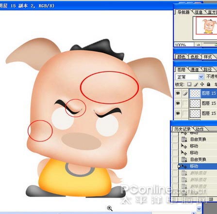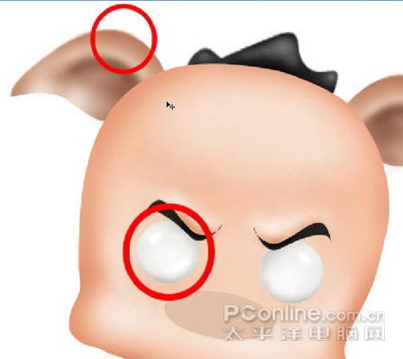 (3)现在用减淡工具和加深工具对画面的的暗面和亮面进行加深减淡。特别是额头的部分要注意不能太暗,不然额头就很可能会显得特别大。红圈圈出来的地方需请特别注意。