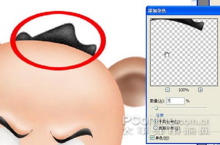 (5)在刻画头发地方时,用滤镜里的杂色/填加杂色(数量7 。选平均分布 。单色)。而鞋子的地方就加深后做个选区拉渐变就可以了。