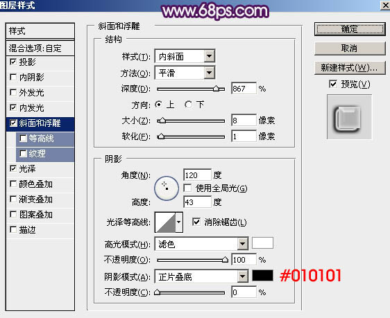 内发光:混合模式“滤色”,颜色为白色,其它设置如下图。