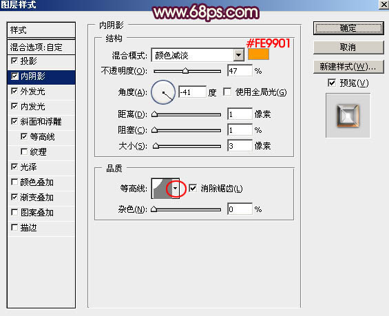 内阴影:混合模式“颜色减淡”,颜色为橙色:#FE9901,其它设置如下图。然后点击等高线的下拉小三角,选择等高线,如下图。