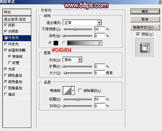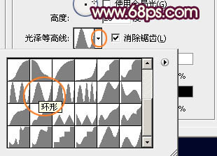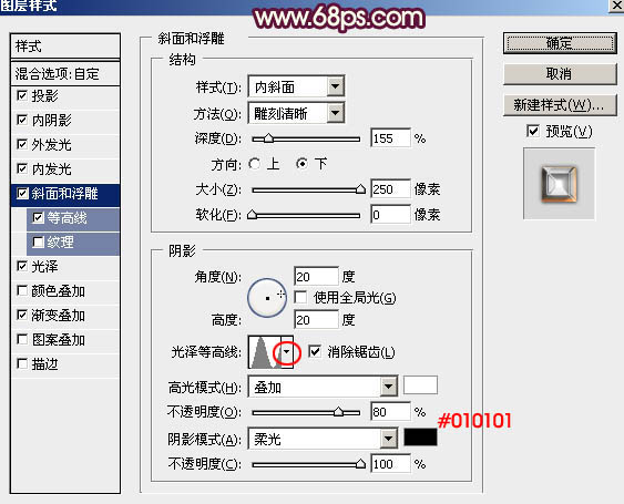 斜面和浮雕:方法为“雕刻清晰”,其它设置如下图。然后点击等高线右侧的下拉小三角,选择一款自带的环形等高线,如图20。