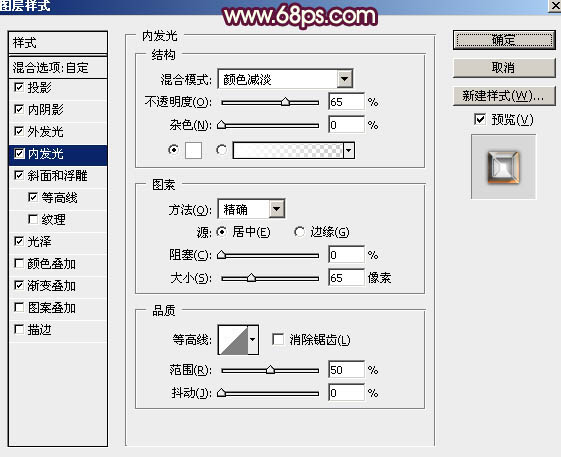 内发光:混合模式为“颜色减淡”,颜色为白色,其它设置如下图。