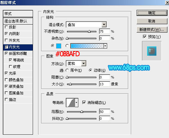内阴影:混合模式为“叠加”,颜色为淡蓝色:#caf7fc,其它参数如下图。