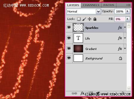 16、这将添加一个简单的发光火花。把“火花”图层的填充值改为0%。