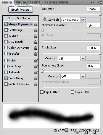 形状动态:请务必选择大小抖动-控制下拉菜单中的钢笔压力。