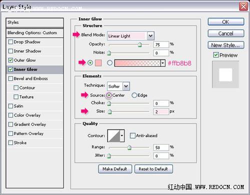 内发光:改变混合模式为“线性光”,颜色#ffb8b8,来源为中心,大小2。