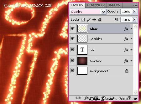 20、更改“发光”图层的混合模式为“叠加”。文本现在挺亮了。