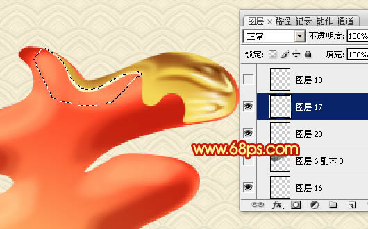 14、新建一个图层,用钢笔勾出边缘部分的高光选区,填充淡黄色。