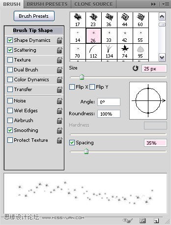 5、打开笔刷面板(窗口--笔刷)在笔刷笔尖形状预览中选择一种可用的星光类笔刷,改变大小在25像素左右,间距35%。