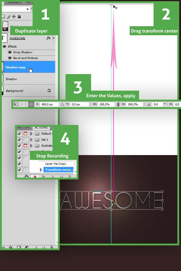 选中复制的图层,进入自由变换模式(Ctrl+T),将中心点拉到画布的最上方,并将图层水平和垂直缩放为100.2%。