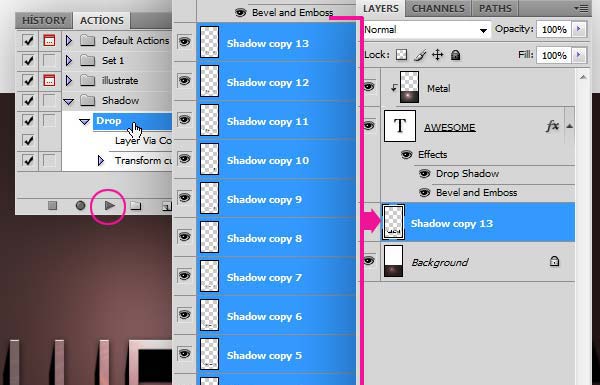 8、选中阴影图层,在动作面板选择刚才建立的动作,按播放键十几次,这样就得到了十几个增量偏移的图层,将它们合并成一个图层。