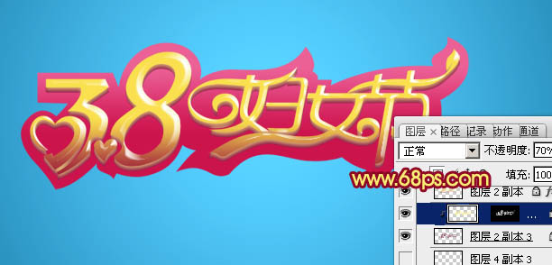 8、调出文字部分的选区,在文字图层下面新建一个图层,填充暗红色:#8E1C4A,取消选区后把文字稍微往右下移动几个像素做出立体效果。局部有空隙的部分需要用钢笔工具勾出选区并填充相同颜色,效果如下图。