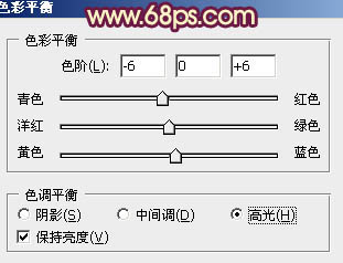 19、创建色彩平衡调整图层,对高光进行调整,参数设置如图34,效果如图35。