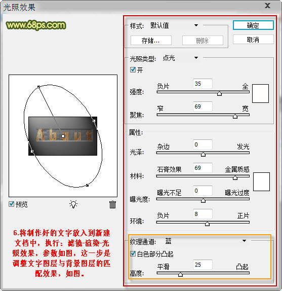 > 渲染 > 光照效果,参数设置如下图。这一步是调整文字图层与背景图层的匹配效果。