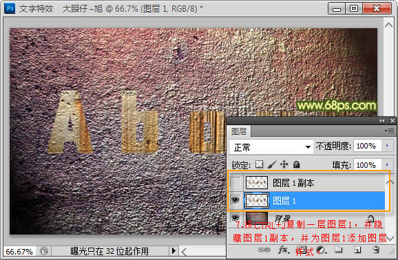 + J 把文字复制一层,并隐藏图层1副本,再给图层1添加图层样式。