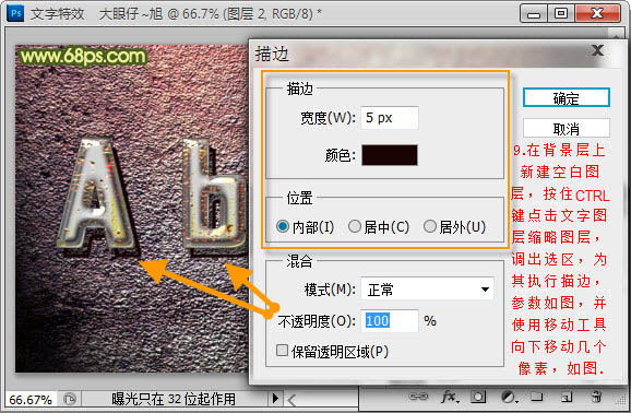 9、在背景层上新建一个图层,按Ctrl点击文字图层缩略图调出选区,为其添加描边,参数设置如下图。确定后用一点工具向下移动几个像素。