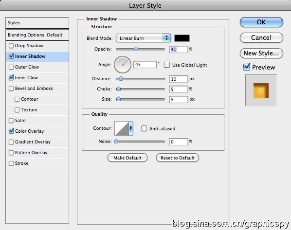 6、选择内阴影,使用黑色,混合模式为线性加深,不透明度40%,角度45,距离10px,阻塞5%,大小5px。