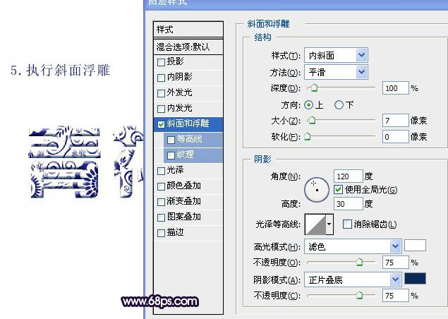 5、添加图层样式,选择斜面与浮雕,参数设置如下图。